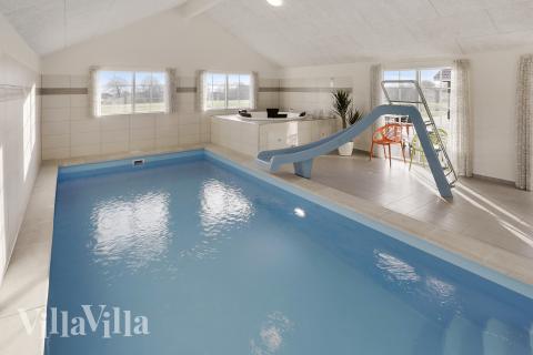 Ein weiterer beliebter Bereich des Luxusferienhauses ist das „Badeland“ mit seinem großem Swimmingpool mit Wasserrutsche, Gegenstromanlage und römischer Treppe. Im Whirlpool oder in der Sauna kann man so richtig entspannen und den Urlaub genießen. Wird der Whirlpool nur mit wenig Wasser befüllt, kann er ohne die Sprudelfunktion als Babypool/Planschbecken genutzt werden.