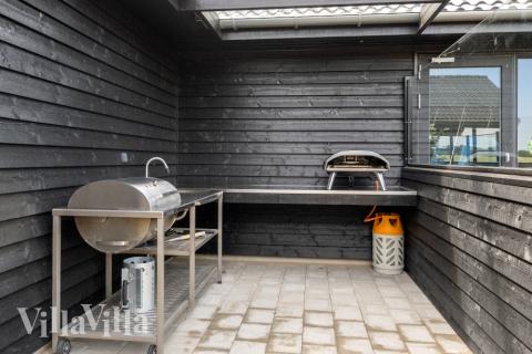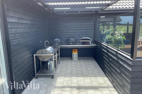 Das Haus ist durchgehend sehr hochwertig ausgestattet. Es hat eine schöne XL-Küche mit zwei Geschirrspülern, Backöfen, und Spülen. Die Kochfelder sind besonders groß und der amerikanische Kühlschrank hat einen integrierten Kaltwasserhahn sowie eine Eiswürfelmaschine. Sie können auch die Außenküche nutzen, die mit Holzkohle- und Gasgrill sowie einem Pizzaofen ausgerüstet ist. Im Innenbereich gibt es einen tollen 23 m2 großen Pool mit Wasserrutsche und leistungsstarker Gegenstromanlage. Genießen Sie ein sprudelndes Bad im Whirlpool oder die warme Sauna, die auch als Infrarotsauna genutzt werden kann. Wer gerne an der frischen Luft ist, kann einfach den Zugang vom Pool zum Wellnessbereich im Freien nutzen. Im Whirlpool den Sternenhimmel zu beobachten ist ein ganz besonderes Erlebnis und im Sommer kann man sich anschließend unter der Außendusche abspülen.