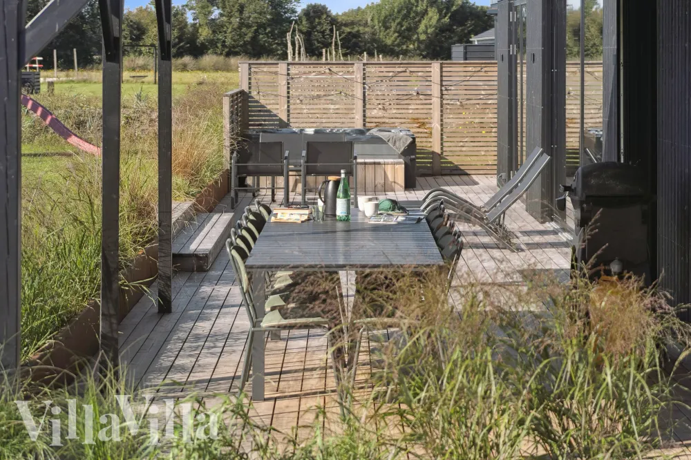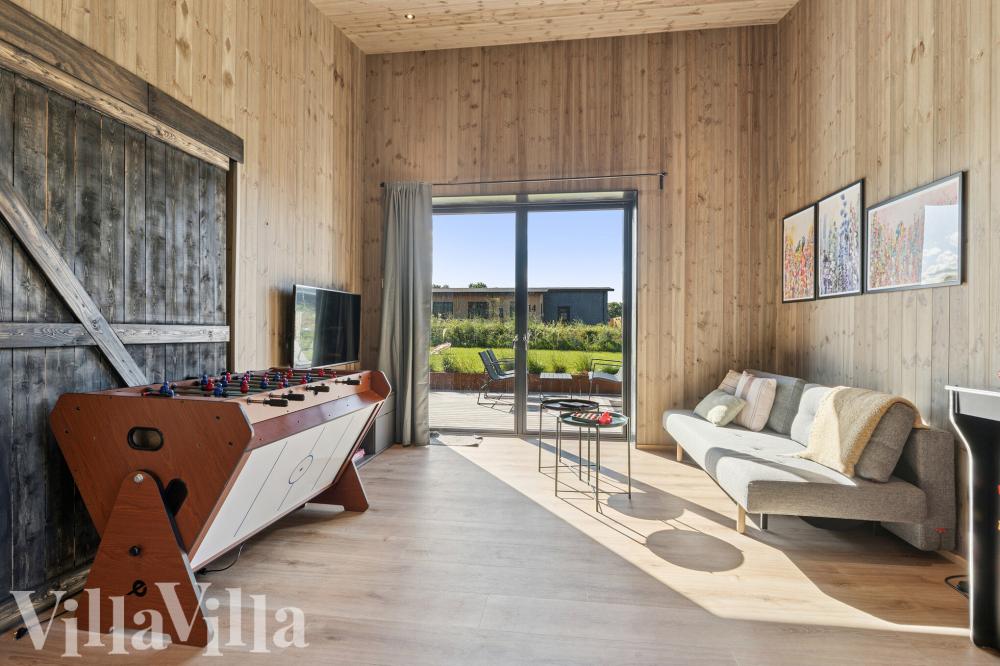 Für unterhaltsame Stunden im Haus steht der Aktivitätsraum bereit. Er ist mit Spielen und einer Sofaecke ausgestattet, ideal für entspannte Abende oder kleine Turniere. Alle Zimmer haben direkten Zugang zum schönen Garten und zur Holzterrasse, die rund ums Haus führt. Hier kann man den Gasgrill anzünden und die Sommerabende genießen, während die Kinder im Garten spielen. Der schöne Wellnessbereich mit Whirlpool und Dusche unter freiem Himmel ist eine echte Wohlfühloase und lädt dazu ein, sich zu entspannen.