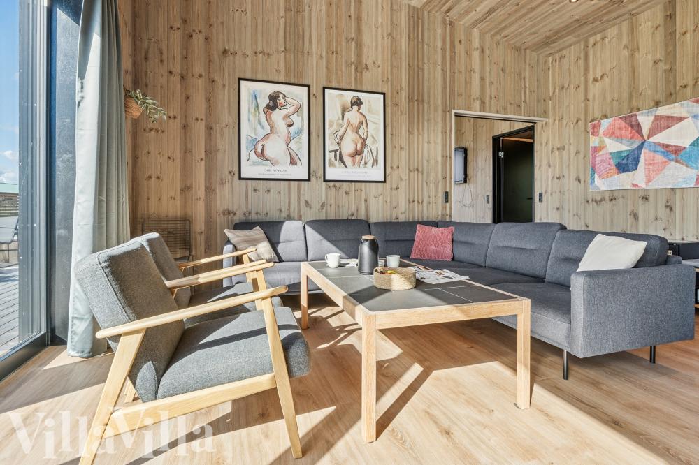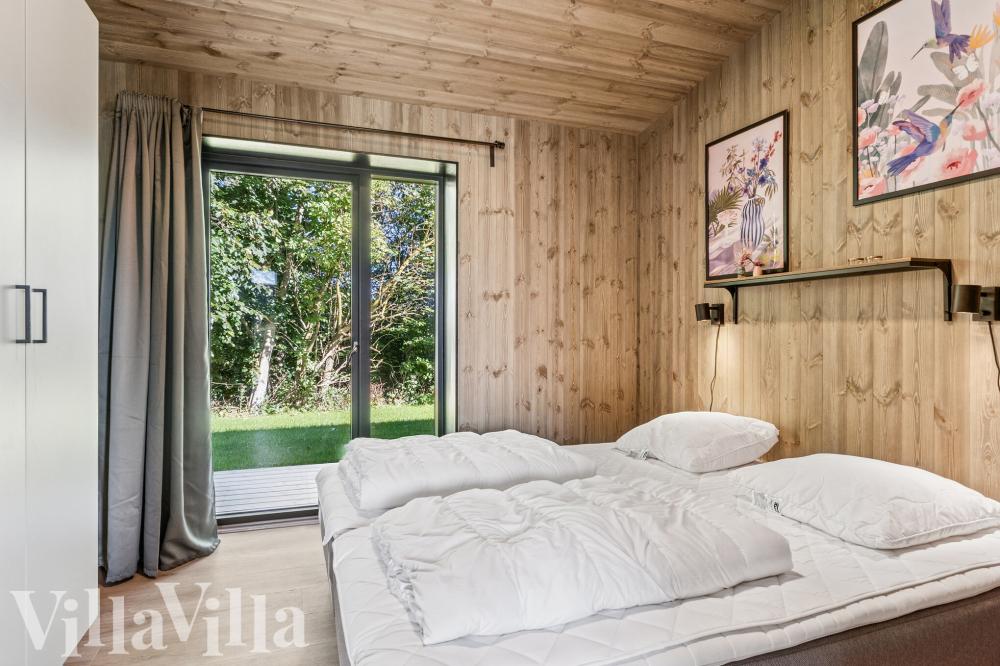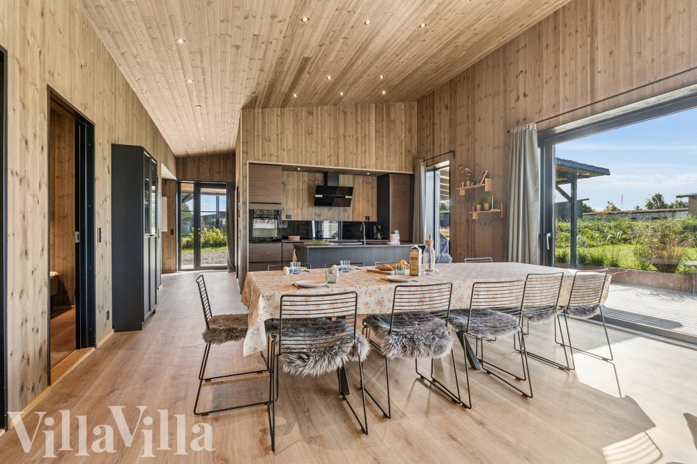 Das Ferienhaus bietet Platz für 12 Personen, verteilt auf fünf Schlafzimmer – darunter eines in einem gemütlichen Anbau mit großen Fenstern und Blick auf die Bäume, sodass es sich fast wie eine Übernachtung im Wald anfühlt. Darüber hinaus gibt es zwei Badezimmer. Die Einrichtung ist modern und behaglich und der Aufenthaltsraum, die Küche und das Wohnzimmer sind der zentrale Treffpunkt des Hauses. Dieser lichtdurchflutete Bereich mit seinen großen Terrassentüren eignet sich perfekt für gemeinsames Kochen, für Brettspiele oder Filmabende.