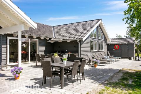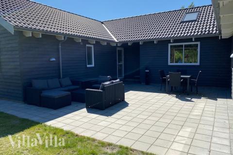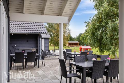 Auch im Außenbereich gibt es für alle Altersgruppen ein umfangreiches Freizeitangebot. Trampolin, Darts, Volleyballnetz, Basketballnetz, Fußballtor, Spielturm, Sandkasten und Schach können von den Ferienhausgästen genutzt werden. Und natürlich lässt sich der dänische Sommer auch auf der Terrasse genießen, die mit hochwertigen Gartenmöbeln ausgestattet ist.