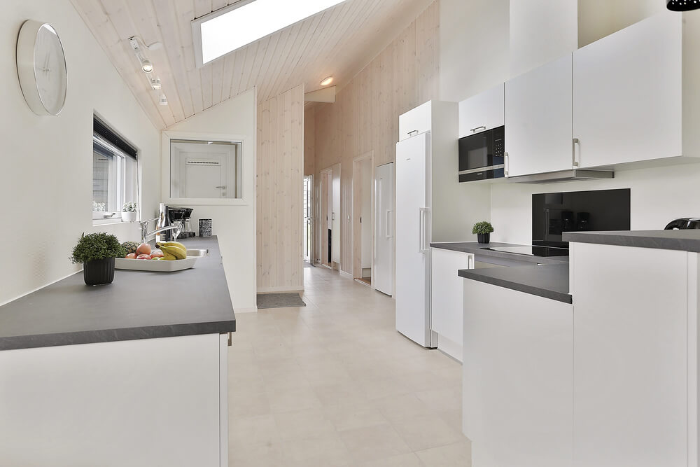 Das Ferienhaus ist mit einem schönen Esstisch und einer Sofaecke eingerichtet. Vor dem Kaminofen kann man es sich bei einem Film oder Buch so richtig gemütlich machen. Die gut ausgestattete, stilvolle Küche ist in den Wohnbereich integriert.