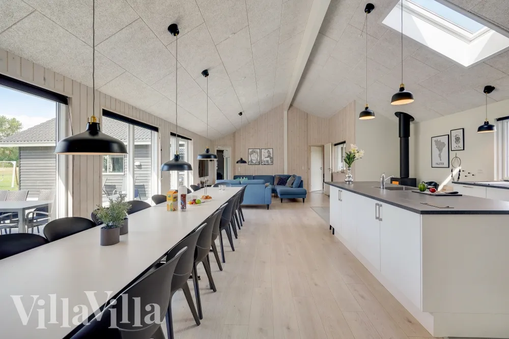 Wenn viele Menschen zusammen Urlaub machen, sind ein langer Esstisch und eine große Küche Pflicht, und natürlich gibt es die auch hier. Mit je zwei Backöfen, Spülen, Spülmaschinen und Herden geht alles leichter. Der Wohn-/Essbereich ist zudem mit einer Sofaecke eingerichtet und hat einen Kaminofen.