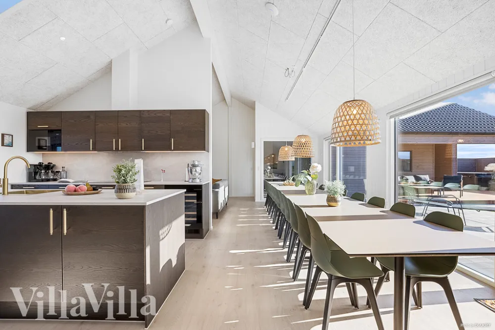 Der große Wohnbereich ist der natürliche Treffpunkt während des Urlaubs. Hier gehen Wohnzimmer, Essbereich und die großzügige XL-Küche in einen offenen Raum über. Die Küche ist mit zwei Geschirrspülern und zwei Kühlschränken praktisch für viele Gäste eingerichtet. Auch zusätzliche Ausstattung wie eine Nespresso-Maschine, eine Küchenmaschine und ein Mixer ist vorhanden. Auch einen Weinkühlschrank für die guten Flaschen finden Sie hier. Der lange Esstisch bietet Platz für alle und dank des Projektors mit Leinwand ist der Raum ideal für alles von Filmabenden und Sportübertragungen auf Großbildschirm bis hin zu Firmenveranstaltungen und Präsentationen.