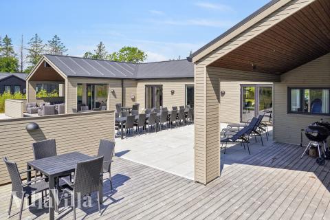Große Teile der schönen Terrasse sind aus Holz. Unter dem überdachten Teil der Terrasse befinden sich ein luxuriöser Grill und Gartenmöbel mit Sitzgelegenheiten für alle. Im Loungebereich kann man es sich gemütlich machen, während die Kinder auf dem Spielplatz im Garten toben. Dort stehen Schaukel, Sandkiste und ein in den Boden eingelassenes Trampolin bereit. Ein zusätzliches Plus dieses Hauses ist der große Mehrzweckplatz, der mit dem Nachbarhaus geteilt wird. Hier können Sie Fußball, Basketball, Volleyball und vieles mehr spielen. In diesem wunderschönen Ferienhaus für bis zu 30 Personen gibt es Aktivitäten, die für alle Altersgruppen geeignet sind.