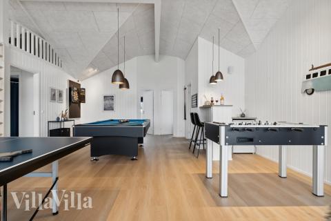 Das Haus bietet zudem ein großes Angebot an Freizeitaktivitäten. Im Aktivitätsraum erwartet Sie Unterhaltung für jede Altersgruppe, darunter Billard, Tischtennis, Darts und Tischfußball – ideal für spannende Matches. Für eine kleine Erfrischung zwischendurch steht die Hausbar bereit – Sie müssen nur Ihre Lieblingsgetränke mitbringen. Zusätzlich bietet das Haus einen eigenen Poolbereich, in dem sich Groß und Klein beim Schwimmen austoben und entspannen können. Vom Poolbereich und vom Aktivitätsraum aus gelangt man direkt auf die teilweise überdachte Terrasse mit Heizstrahlern, die im Sommer zum langen Verweilen bei einem Grillabend einladen, den man auf der Terrasse in den gemütlichen Gartenmöbeln genießen kann.
