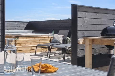 Auch wenn das Wetter einmal nicht mitspielt: In der beeindruckenden überdachten Außenküche mit drei Grills können Sie auf der Terrasse wunderbar Urlaubsmahlzeiten zubereiten. Hier kann man es sich am langen Esstisch schmecken lassen, anschließend mit einem Drink in der Hand auf den weichen Loungemöbeln unter dem Vordach entspannen, und den Kindern beim Trampolinspringen zuschauen.