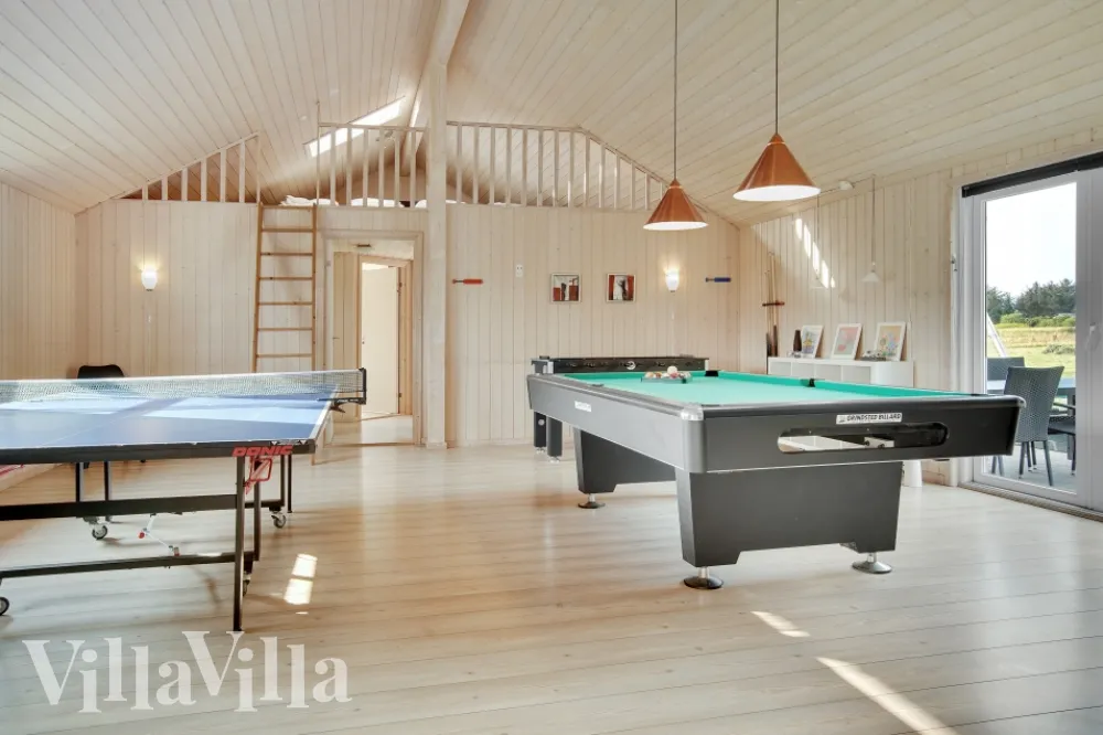 Das Luxushaus verfügt zudem über einen spannenden Aktivitätenraum, in dem die ganze Familie gegeneinander in Billard, Kicker, Tischtennis und Dart antreten kann. Ist die Spiellust danach immer noch nicht gestillt, können Sie sich auch gegenseitig an der Playstation 4 herausfordern. In Spielpausen können Sie auch gerne die kostenlose Internetverbindung des Hauses nutzen und beim Surfen ein wenig entspannen. Kinder zieht es auch nach oben auf den herrlich behaglichen Spieledachboden, der viele unterhaltsame Stunden verspricht.