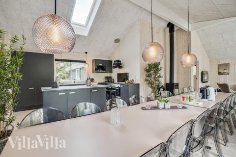 Am langen Esstisch können alle Gäste gemeinsam ihre Mahlzeiten einnehmen. In der Mitte des Wohnzimmers steht ein Kaminofen in der Nähe der Sofaecke und des Fernsehers. Die große, stilvolle Küche ist in den Wohnbereich integriert.