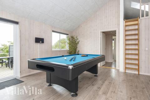 An die Essecke schließt sich der Wohnbereich an. Weiche Sofas laden dazu ein, Platz zu nehmen und den Tag zu planen. Auch steht ein großer Fernseher für Filmabende bereit. Wenn Sie allerdings im Urlaub in Dänemark nicht stillsitzen können, wird der großartig ausgestattete Aktivitätsraum des Ferienhauses Sie begeistern.