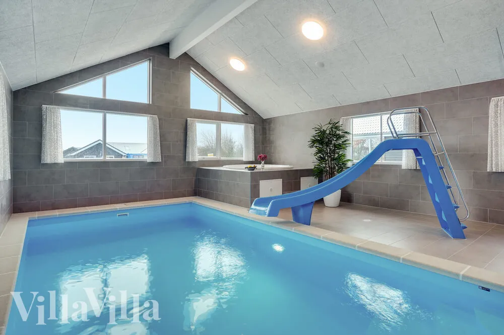 Hier kommt bei Wasserratten garantiert keine Langeweile auf, denn das Ferienhaus verfügt über einen eigenen 20 m2 großen Innenpool mit Wasserrutsche, römischer Treppe und Gegenstromanlage. Im Poolraum gibt es zudem einen tollen Whirlpool und eine Sauna – beste Voraussetzung für ein rundum gelungenes Wellnesserlebnis.