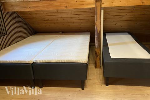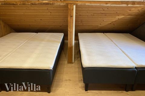 Das 360 m² große Ferienhaus bietet Platz für bis zu 26 Personen in sieben Schlafzimmern. Vom Wohnzimmer aus hat man Zugang zu zwei Schlafzimmern, eines mit zwei Doppelbetten, das andere mit einem Doppelbett. Über einen Zwischengang erreicht man drei weitere Schlafzimmer, eines davon ist ein Durchgangszimmer mit einem Doppelbett sowie zwei Einzelbetten. Es führt in ein weiteres Schlafzimmer mit einem Etagenbett und zwei Doppelbetten. Alle Betten lassen sich trennen; das Platzangebot ist jedoch begrenzt. Von hier aus gelangt man in ein großes Badezimmer mit Badewanne und Wickeltisch.