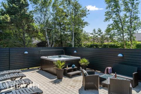 Auf dieser Terrasse erwartet Sie neben dem Essbereich und dem Grill noch ein weiteres Wellness-Highlight. Am einen Ende der Terrasse befindet sich ein Whirlpool, in dem man im Freien ein sprudelndes Bad genießen kann. Bei gutem Wetter lockt der gemütliche Lounge-Bereich, der sich zusammen mit dem Außen-Whirlpool hinter dem Windschutzzaun befindet.