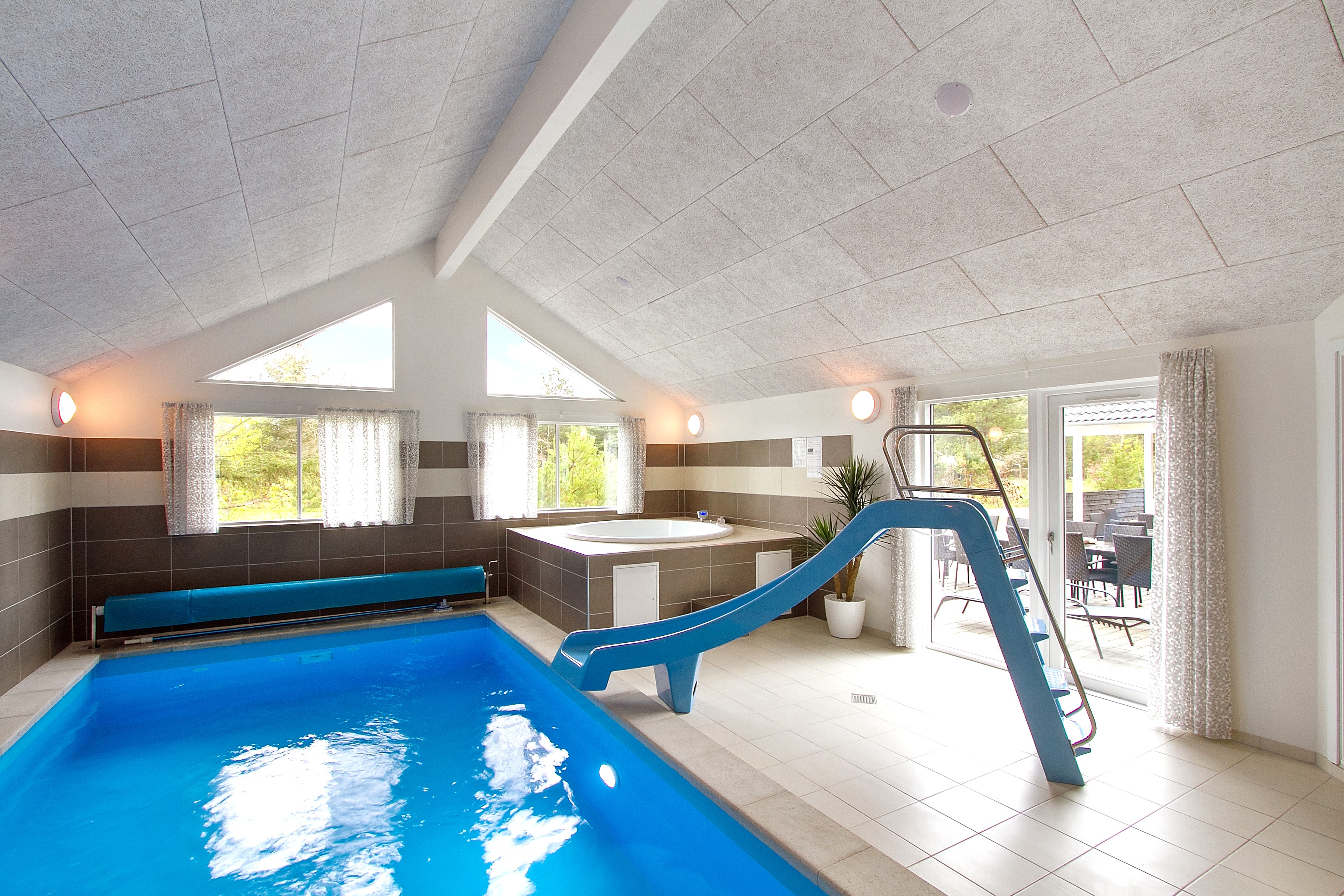Im luxuriösen Wellnessbereich des Ferienhauses finden Sie einen 20 m2 großen Innenpool mit Wasserrutsche und römischer Treppe sowie einen Whirlpool und eine Sauna- gerade an kühleren Tagen eine unwiderstehliche Versuchung.