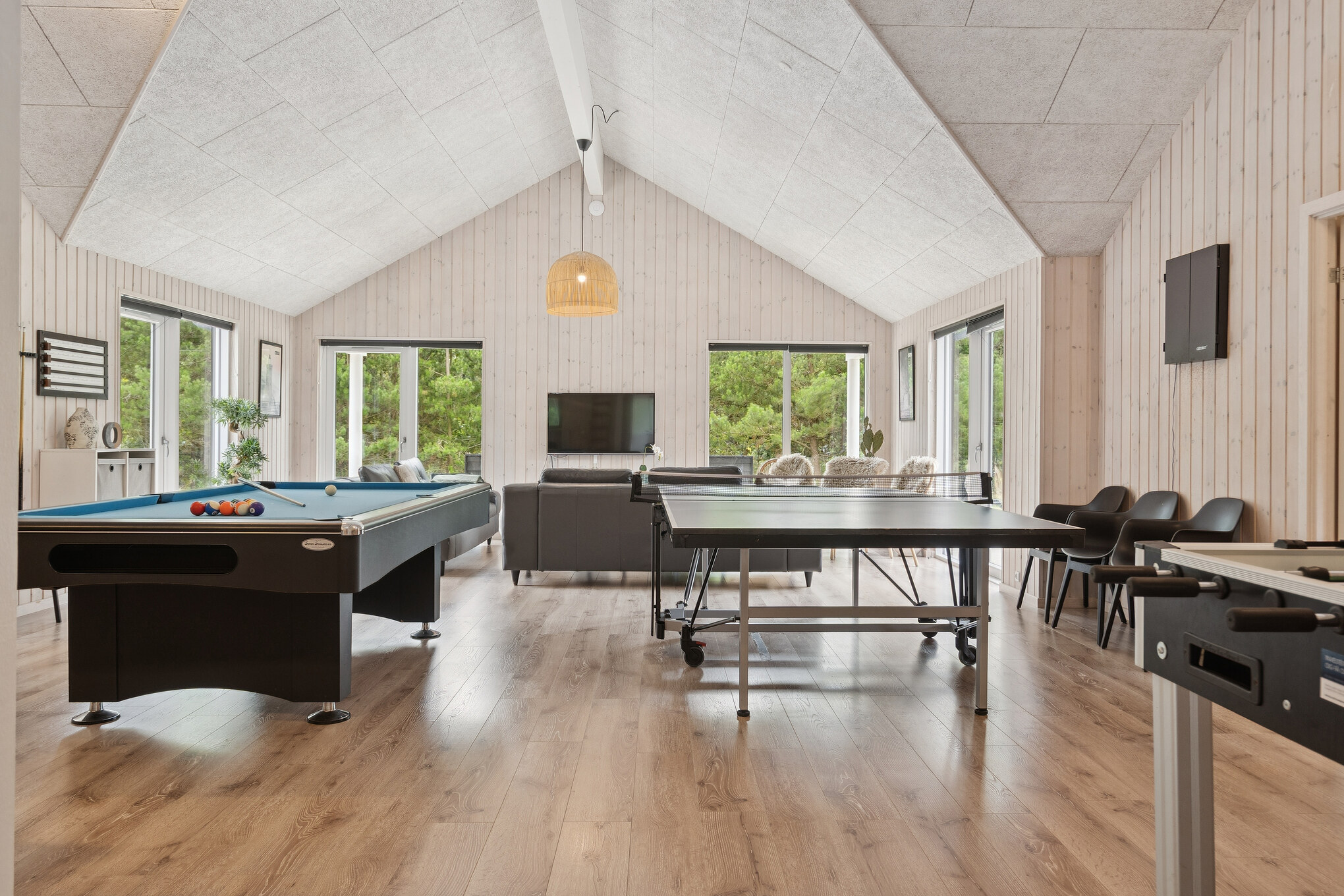 In diesem fantastisch ausgestatteten Luxusferienhaus kommt garantiert keine Langeweile auf. Das Ferienhaus verfügt neben dem Poolbereich auch über einen großen Aktivitätsraum, der mit Tischfußball, Billard, Tischtennis, PlayStation 4 sowie Dart eingerichtet ist. Hier finden Sie auch eine schicke Bar mit Kühlschrank, an der man sich beim Spiel mit kühlen Getränken erfrischen und andere Wettstreitende anfeuern kann.
