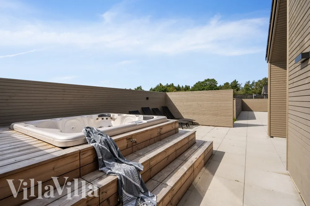 Gut ausgestattetes Ferienhaus mit Whirlpool und Sauna im Freien.