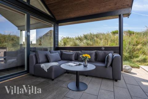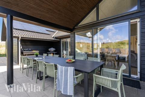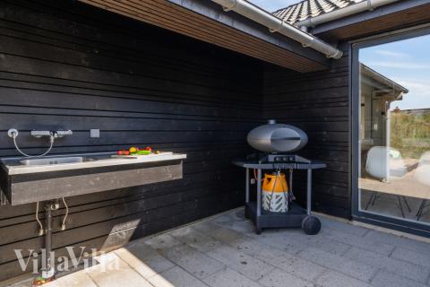 Vom Wohnzimmer aus gibt es einen direkten Zugang zur großen, teilweise überdachten Terrasse, auf der Sie den dänischen Sommer in extra gemütlichen Gartenmöbeln genießen können. Hier finden Sie eine stilvolle, überdachte Außenküche mit Gasgrill, die reichlich Gelegenheit bietet, an dem schönen, langen Tisch leckere Mahlzeiten zuzubereiten und zu servieren - perfekt für gemütliche Momente mit Familie und Freunden. Unter der Überdachung finden Sie auch eine einladende Lounge mit einem bequemen Sofa, wo Sie sich entspannen und die Atmosphäre im Schatten genießen können.